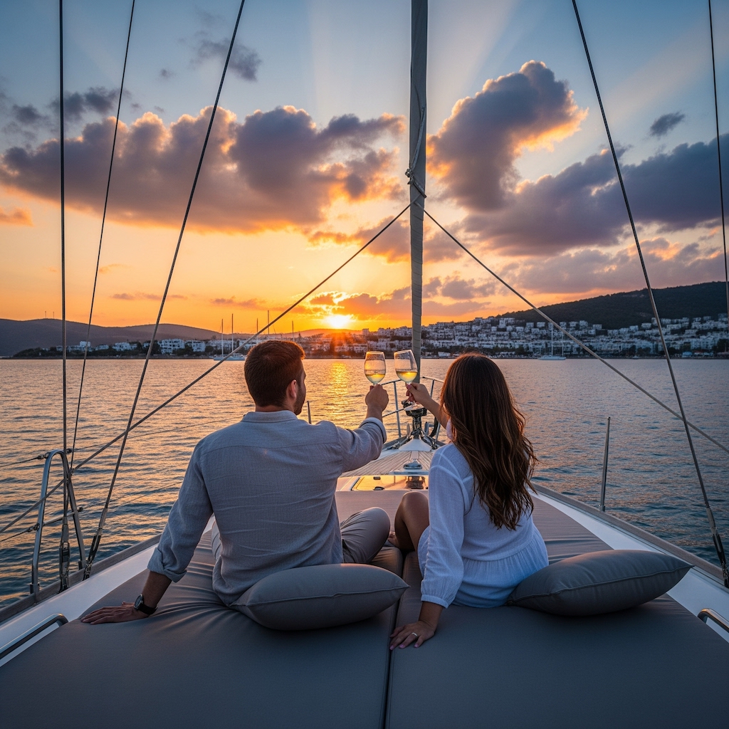 Bodrum’un en çarpıcı koylarından birinde, ya da ufukta Bodrum manzaralı güvertede iki kişilik özel bir masa, yelkenlerin gölgesinde gün batımı ve şarap.